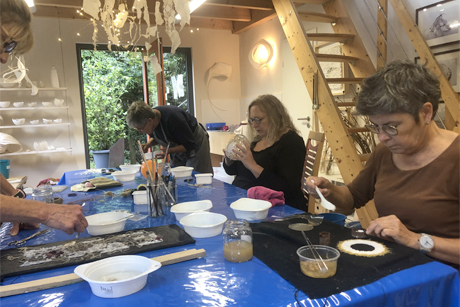 Die Kunstwerke brauchen mehrere Tage zum Trocknen. Sie können einige Tage später abgeholt werden oder ich verschicke sie an weit gereiste Teilnehmerinnen. Nass sind die Werke für den Transport zu empfindlich.